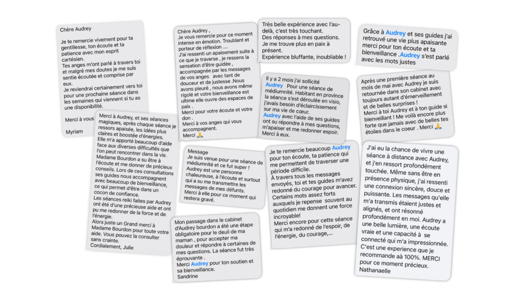 EXCELLENT Based on 5 reviews Posted on david bruinaudTrustindex verifies that the original source of the review is Google. Un retour expérience extraordinaire, 4 mois après notre rdv téléphonique avec Audrey et ses guides,avec sa gentillesse et bienveillance tout nos projets ce sont réalisés comme Audrey nous l avez dit ! En plus Audrey nous a assuré un sav accompagné et rassurant. Nous avons besoin de personne comme Audrey et ses guides.Encore merci Audrey pour tout ce que tu as fait 🙏Posted on Marie ChelleTrustindex verifies that the original source of the review is Google. Audrey et ses guides m’ont accompagnée alors que j’étais à un moment charnière de ma vie. Grace à plusieurs séances j’ai pu prendre les bonnes décisions en lâchant mes peurs et mes doutes et avancer plus sereine vers ma nouvelles vie. Ça m’a redonné de la force, de l’espoir et de l’énergie. Gratitude 🥰💝Posted on Carine TimbertTrustindex verifies that the original source of the review is Google. Audrey est une professionnelle bienveillante et très compétente. Ses séances permettent d'apporter un éclairage enrichissant sur ce qu'on vit. Je recommande ses services 😊Posted on Florence GrosdemangeTrustindex verifies that the original source of the review is Google. Audrey est une thérapeute bienveillante et très connectée ✨ elle m’a beaucoup aidée dans une période de vie compliquée. Elle m’a délivrée des messages puissants qui m’ont permis de me sortir d’un blocage qui me pesait depuis très longtemps. Entre le rire et les larmes, les séances sont libératrices, réconfortantes et redonnent tellement foi et espoir en la vie ! Toutes mes amies sont allées la voir après moi ❤️✨ vraiment n’hésitez plus, vous en ressortirez apaisé.e et boosté.e !Posted on Heidi ZandottiTrustindex verifies that the original source of the review is Google. Merci à Audrey, et ses séances magiques, après chaque séance je ressors apaisée, les idées plus claires et boostée d'énergies. Elle m'a apporté beaucoup d'aide face aux diverses difficultés que l'on peut rencontrer dans la vie. Audrey a su être à l'écoute et me donner de précieux conseils. Lors de ces consultations ses guides nous accompagnent avec beaucoup de bienveillance, ce qui permet d'être dans un cocon de confiance. Les séances reiki faites par Audrey ont été d'une précieuse aide et ont pu me redonner de la force et de l'énergie. Alors luste un Grand merci à Madame Bourdon pour toute votre aide. Vous pouvez la consulter sans crainte.